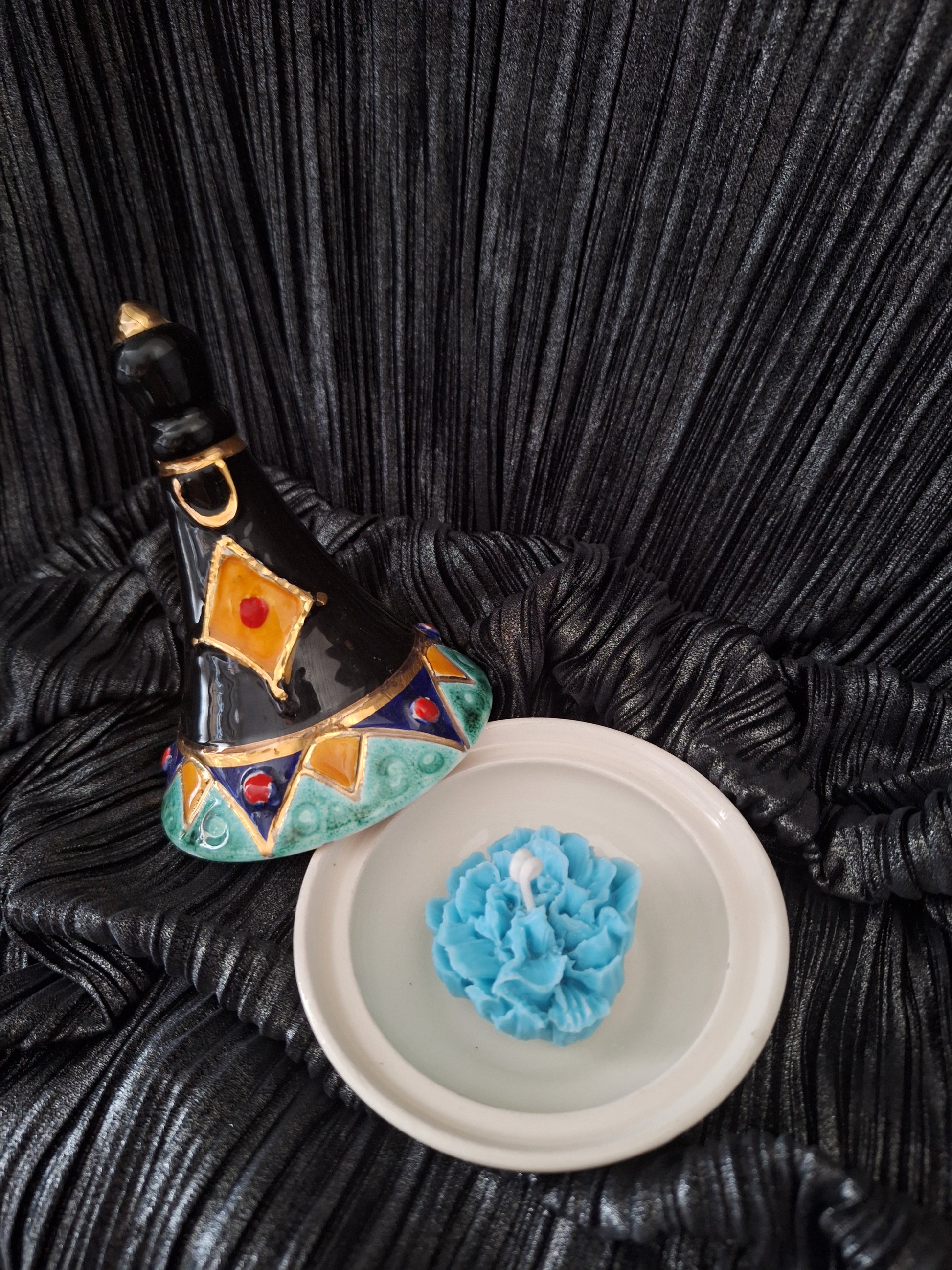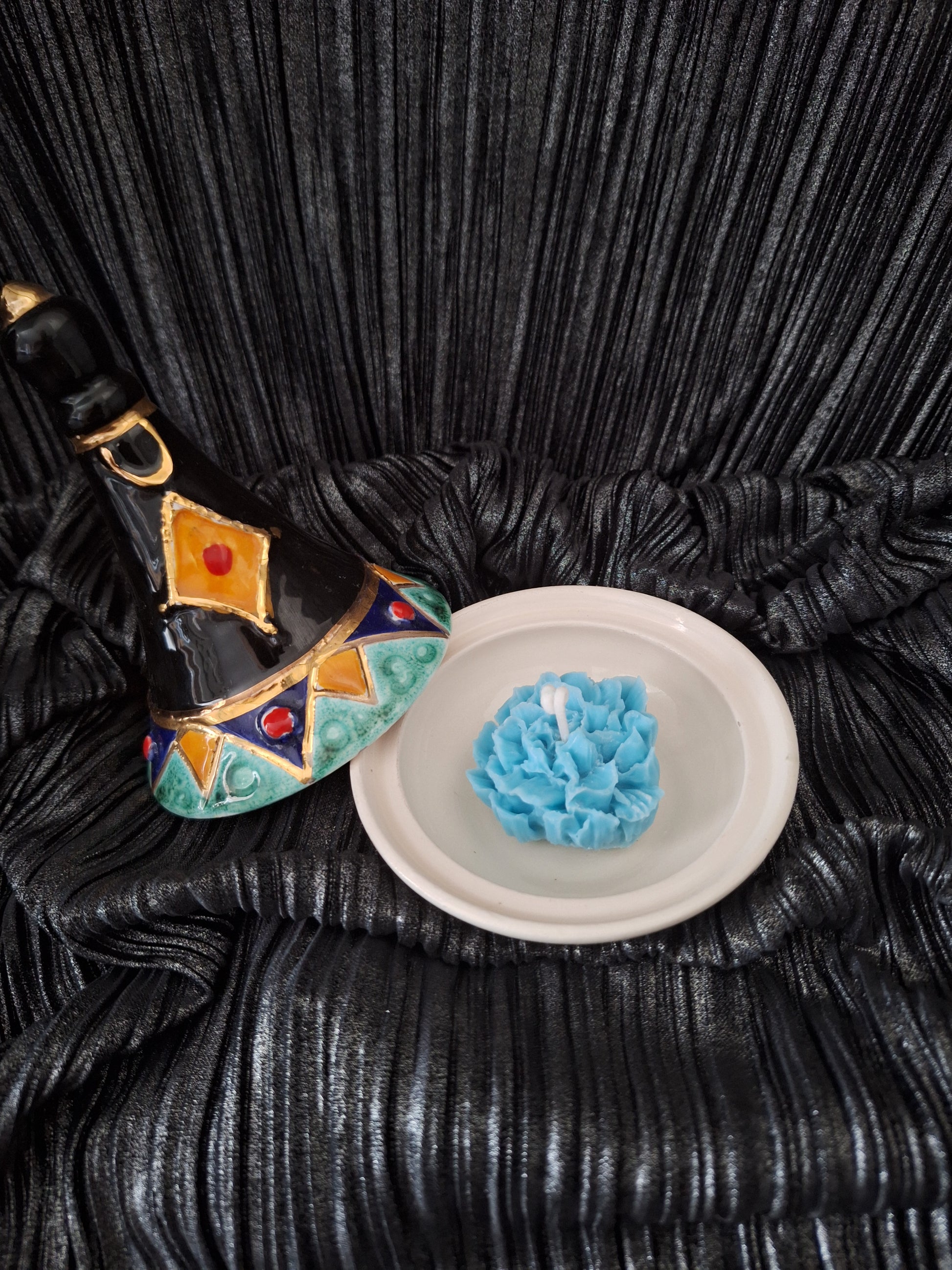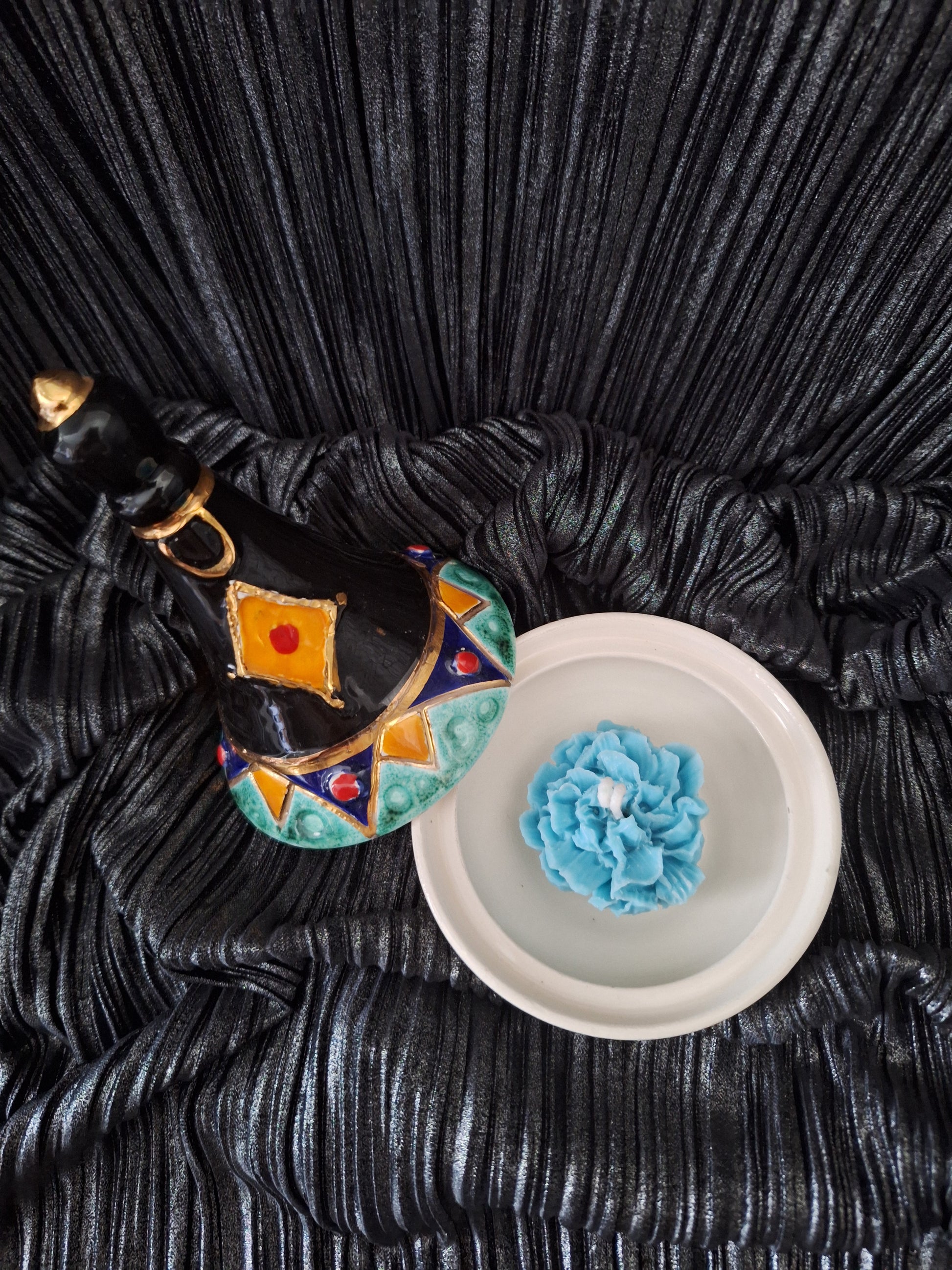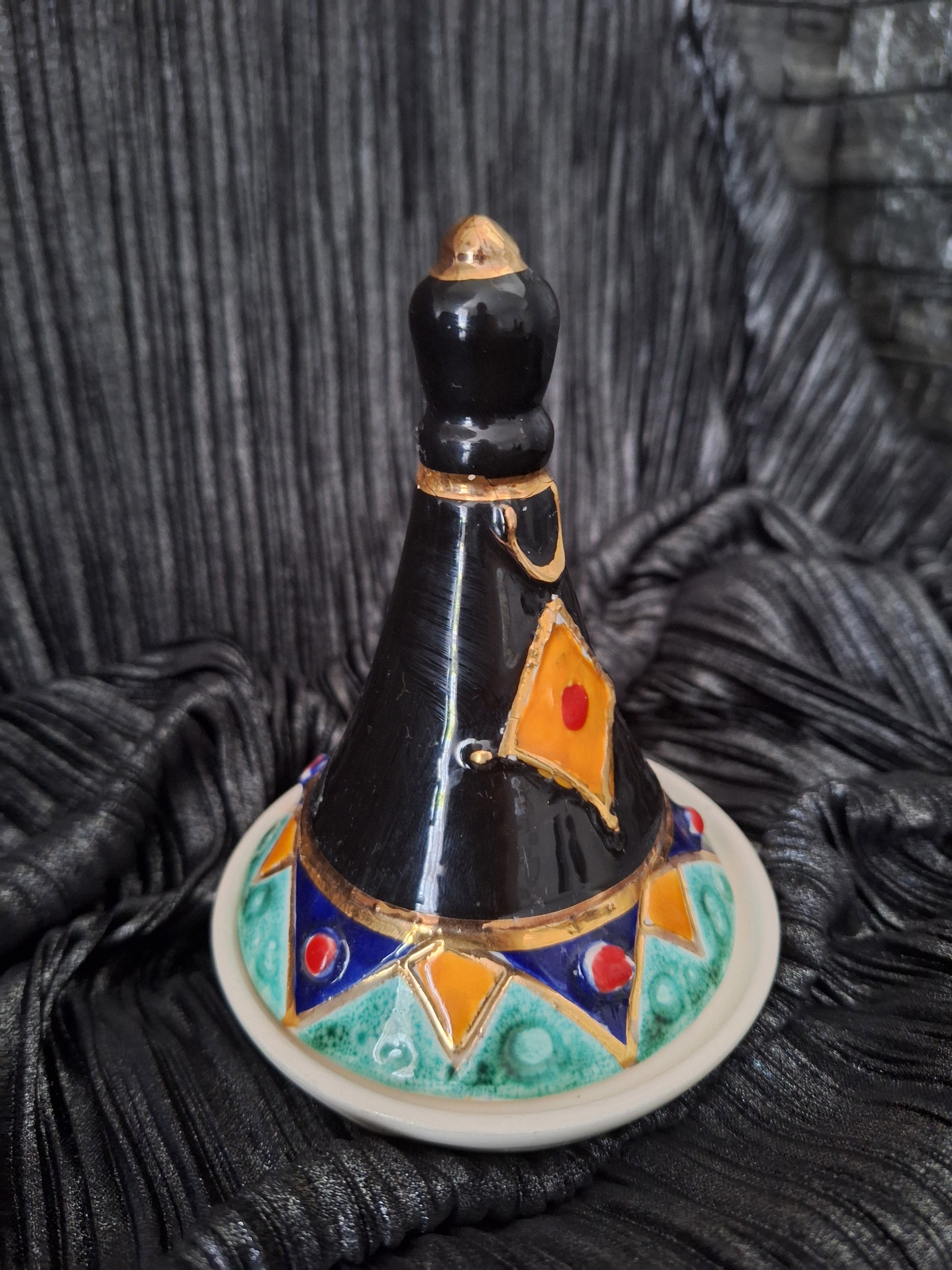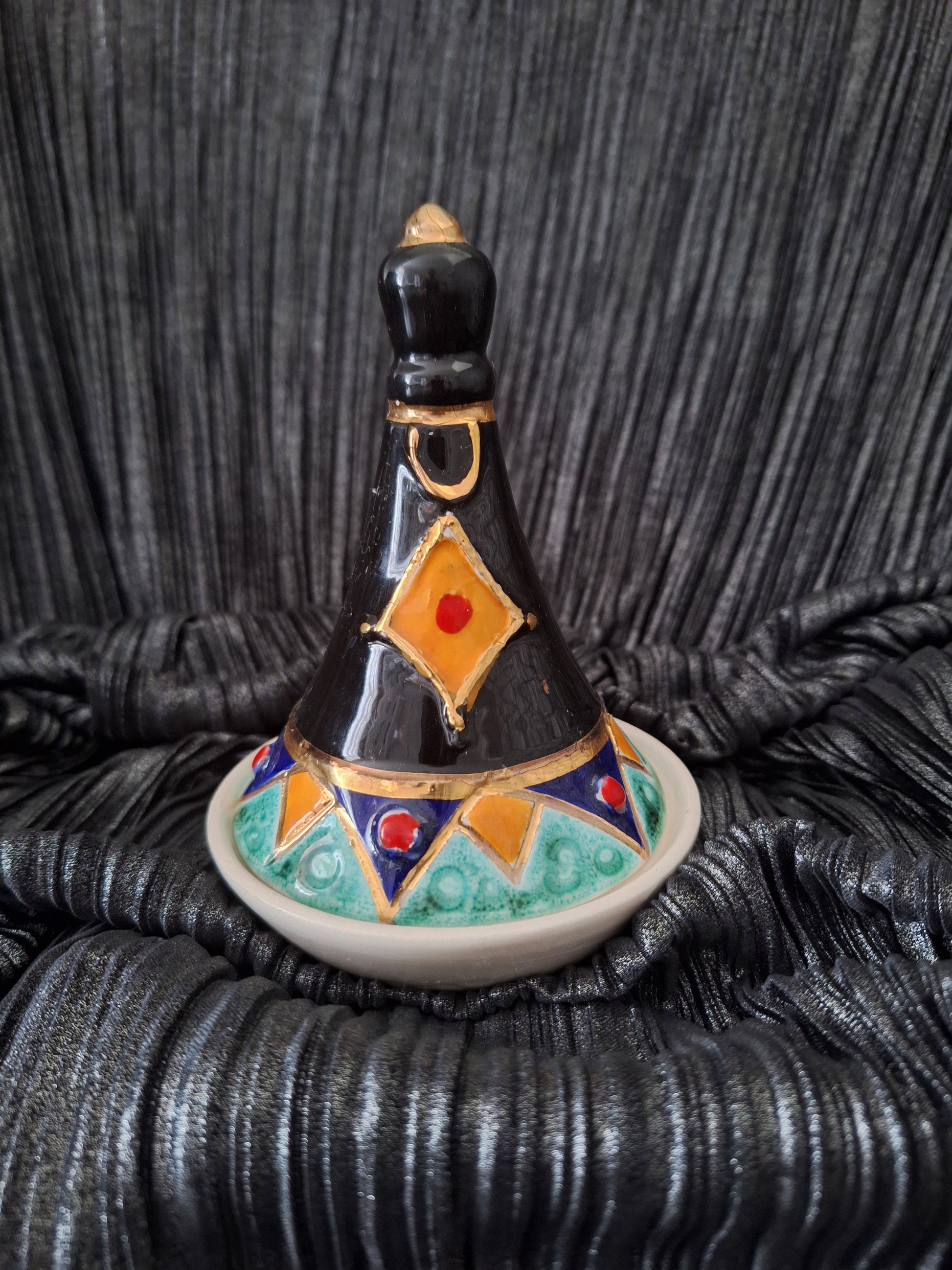 Ce petit tajine, véritable bijou artisanal, séduit par son harmonie de couleurs profondes : le noir raffiné s’allie à l’orange chaleureux, rehaussé de délicates touches de rouge et de doré. Chaque détail reflète un savoir-faire traditionnel et une élégance intemporelle. Posé sur sa petite assiette blanche, qui lui sert de socle, il évoque à la fois la convivialité et le charme authentique des tables de style berbère.