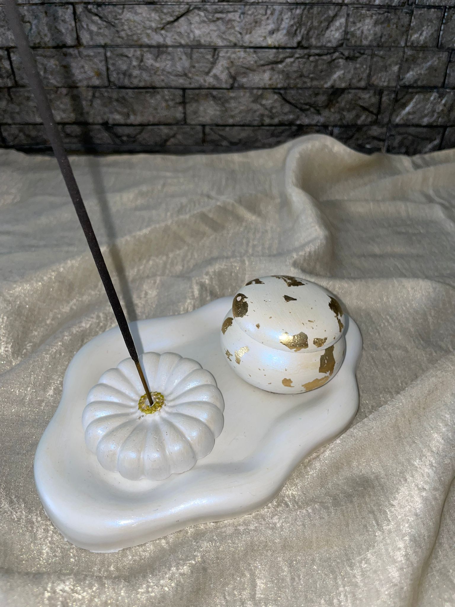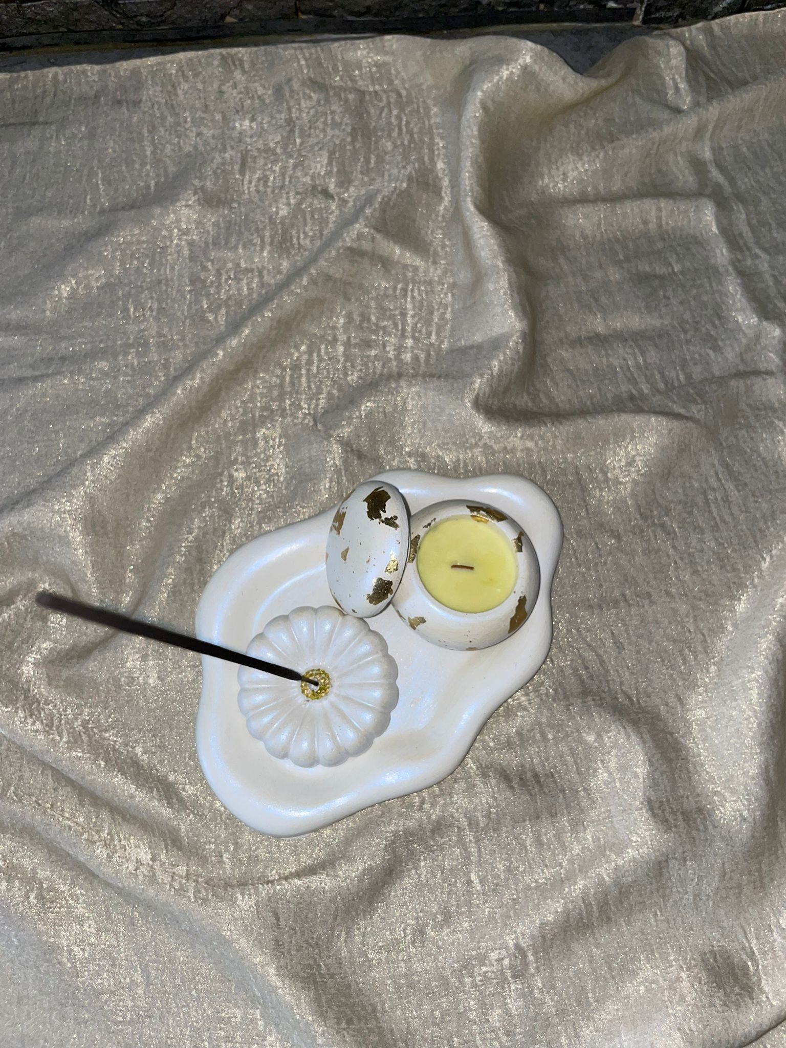 Sur un plateau de ciment aux ondulations douces comme des vagues figées, repose un petit monde de sérénité. Au centre, une marguerite blanche, délicate et épurée, sert de porte encens, saler flneur ouverte prête à accueillir un bâton fumant qui diffuse un parfum subtil dans l'air. À ses côtés, un petit bibelot aux formes rondes et généreuses, comme un galet caressé par la mer, cache en son cœur une bougie au citron gourmand, éclat de lumière et de douceur acidulée. Le tout, nappé d'un blanc nacré lumineux, capte la lumière et la reflète en éclats feutré, transformant ce simple assemblage en un poème silencieux de calme et de douceur.