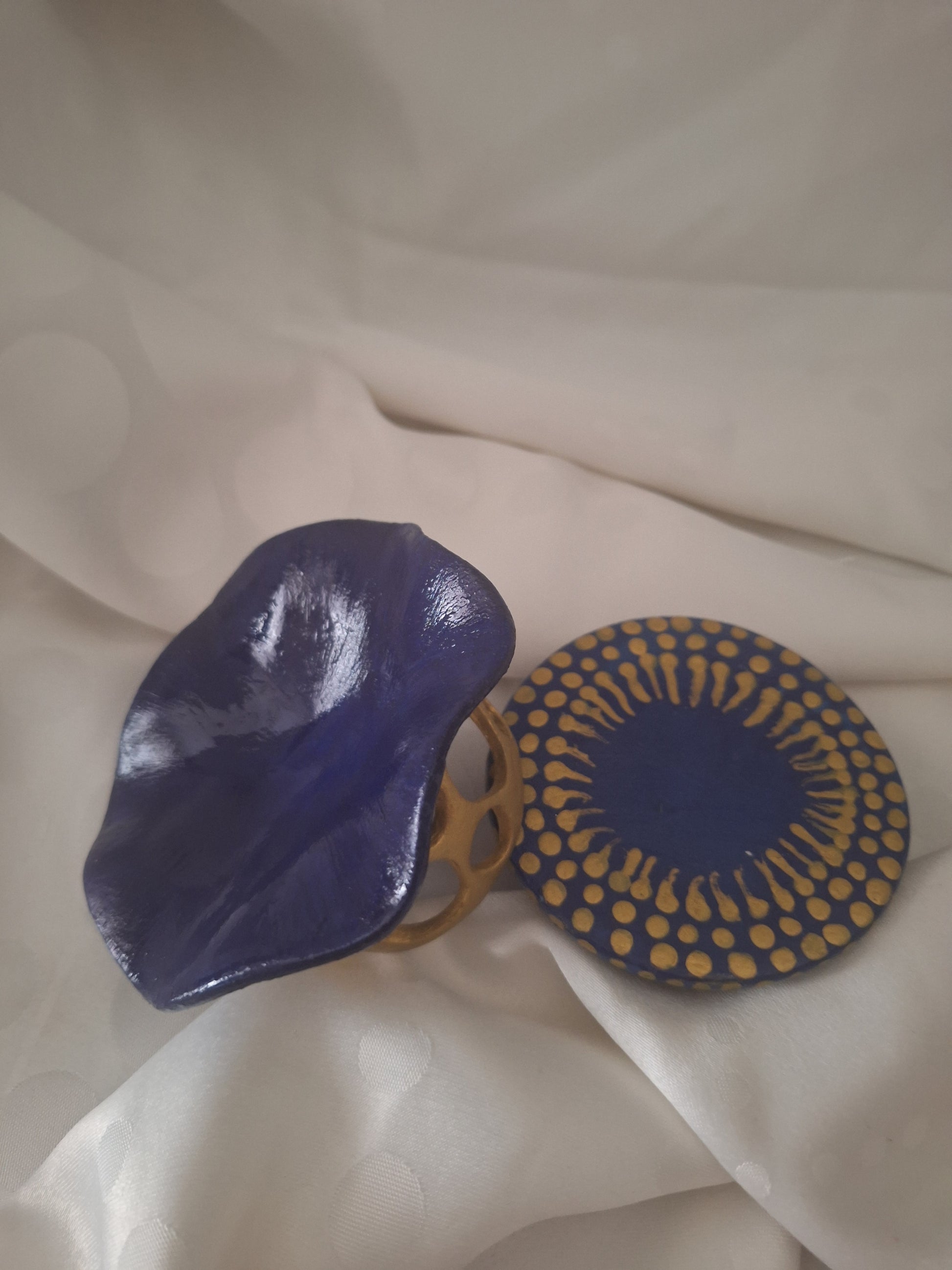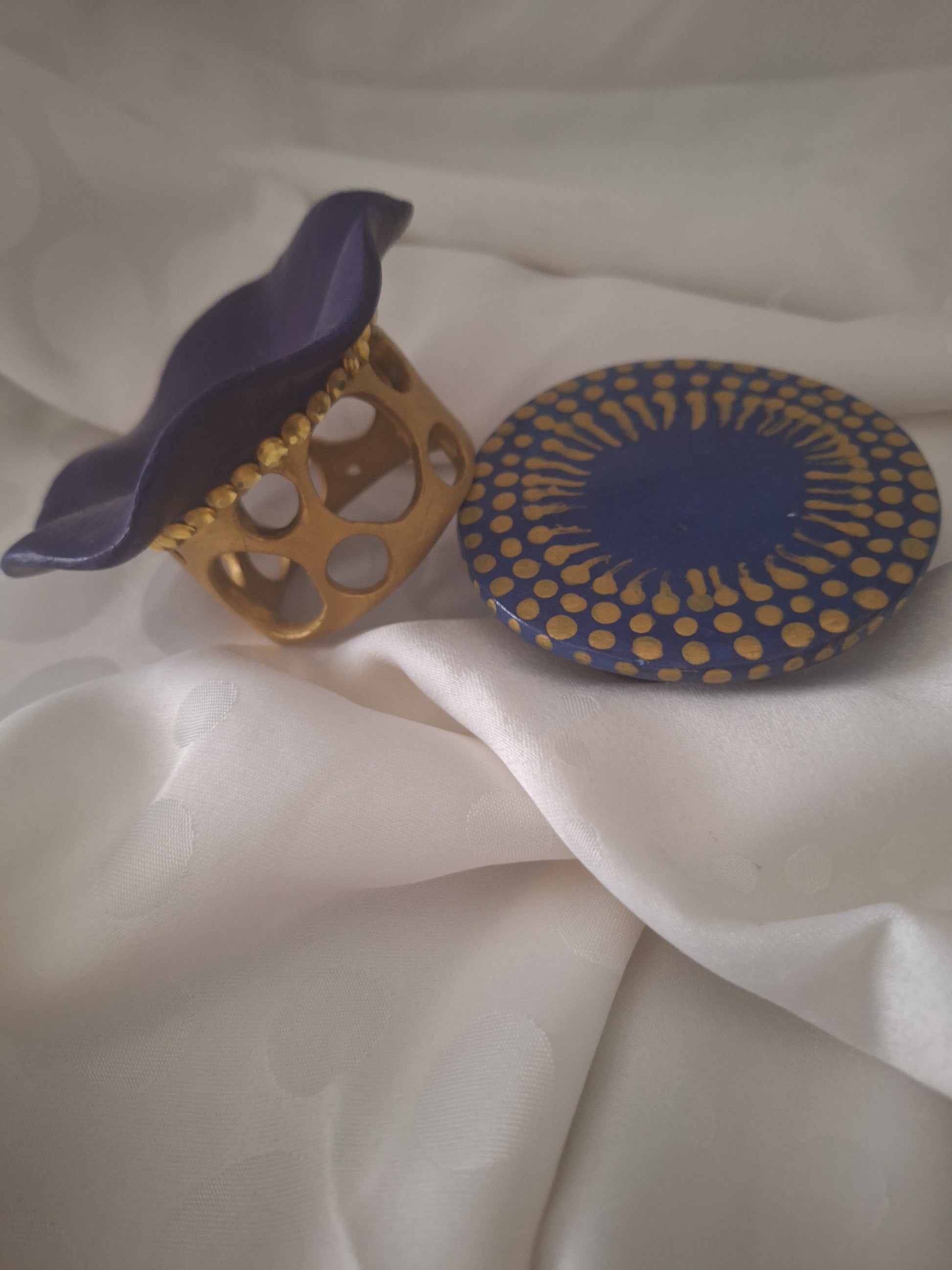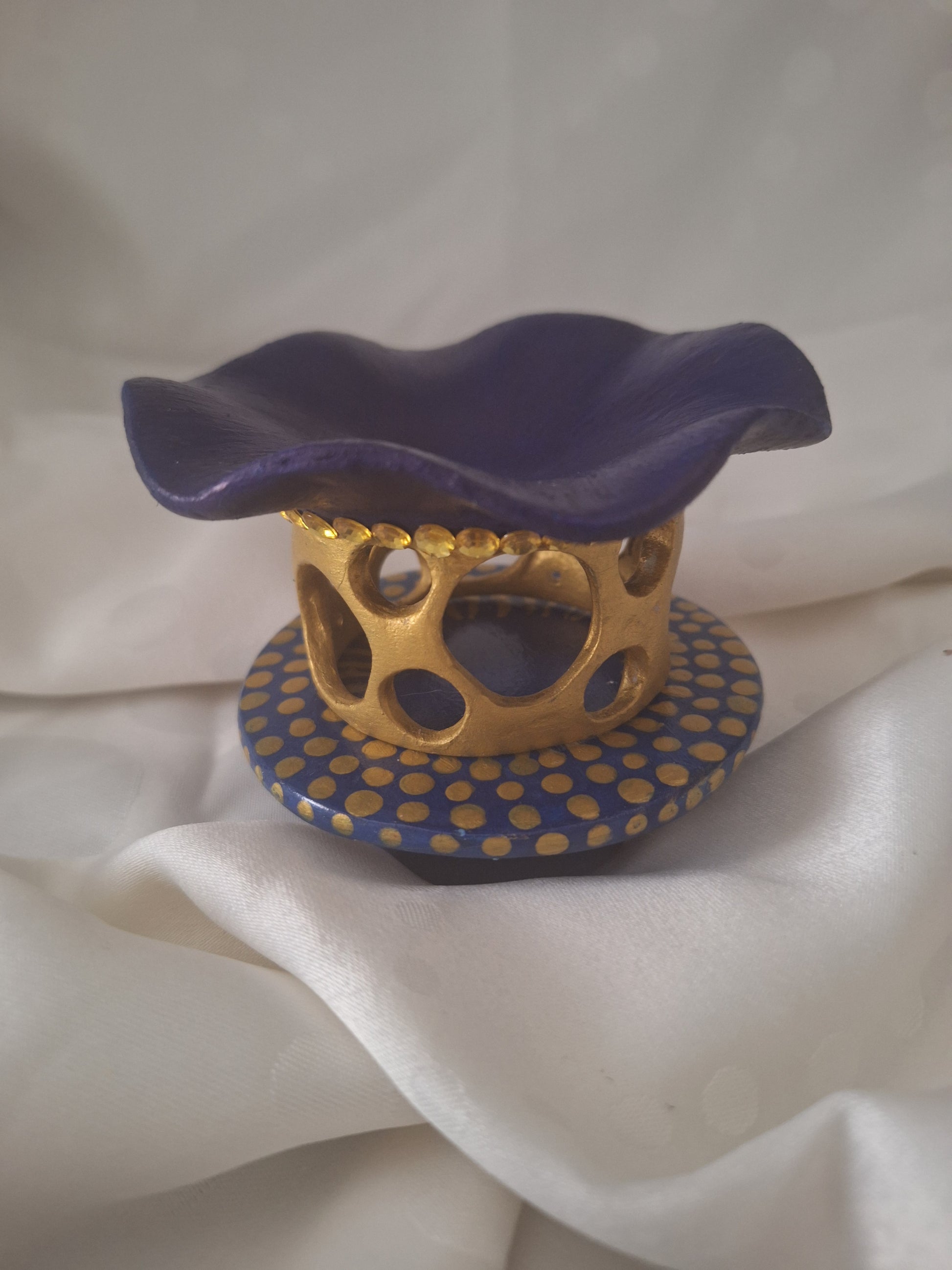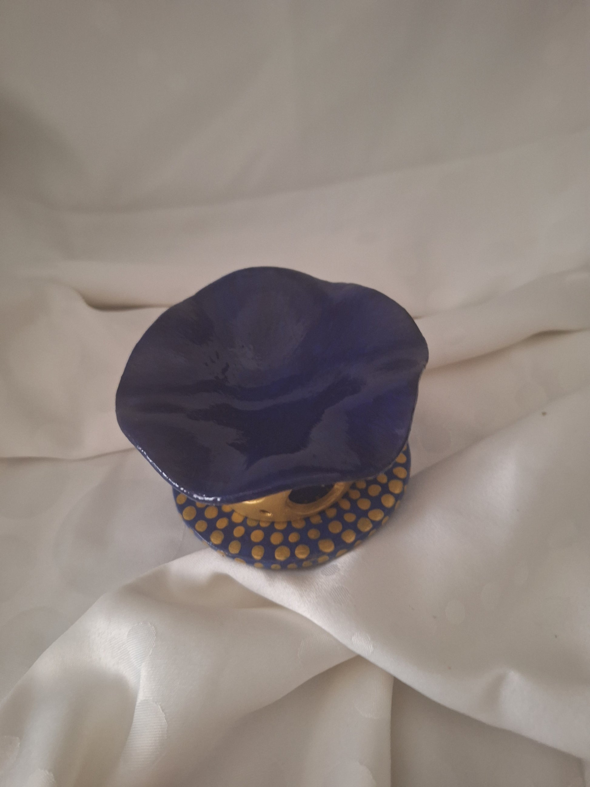 Le socle, dans le même bleu profond, est délicatement parsemé d’une constellation de points dorés, tels des éclats de lumière dansant à la surface de l’eau. Ensemble, ces détails confèrent à la pièce une élégance discrète, à la fois aquatique et solaire.