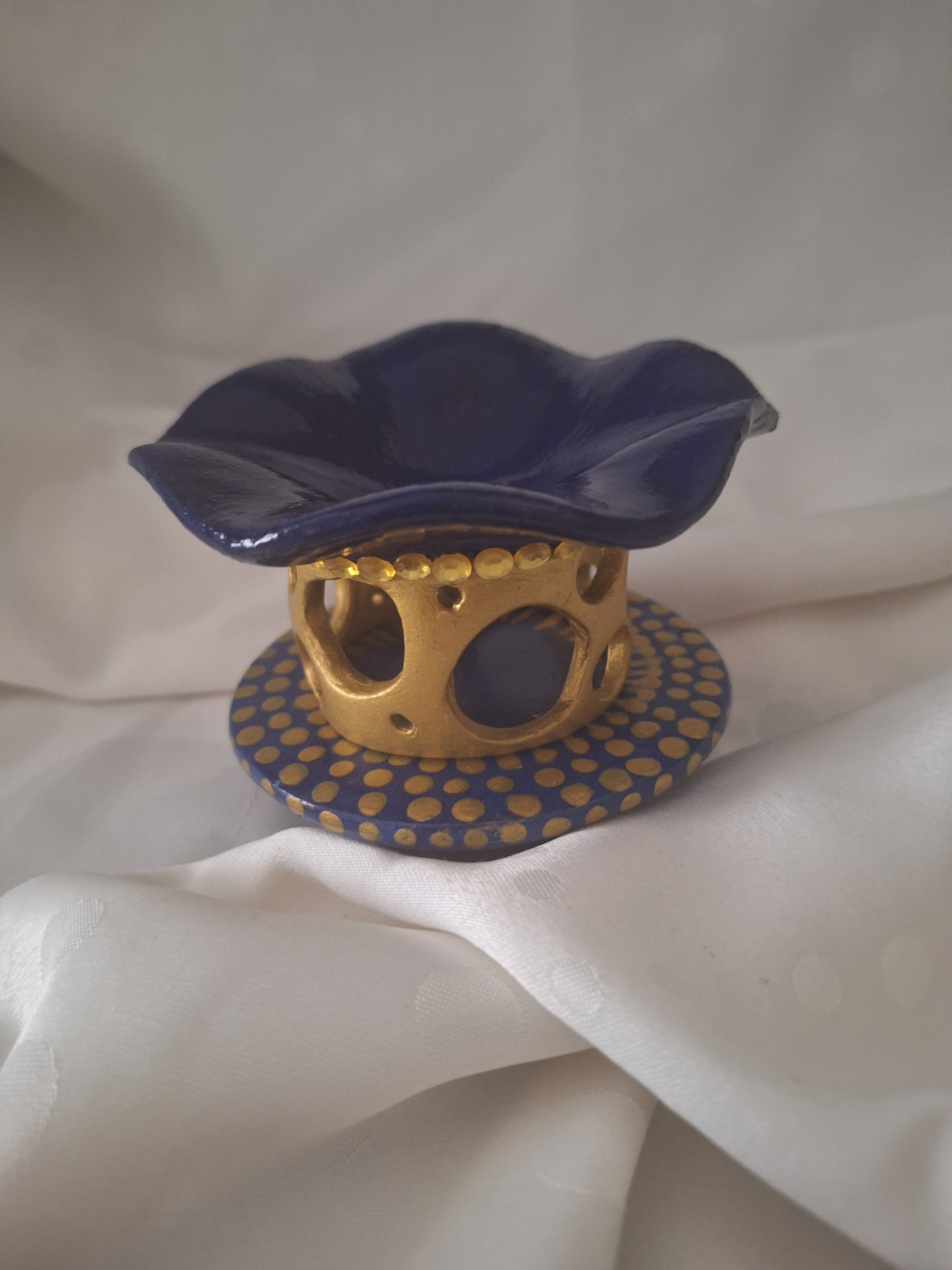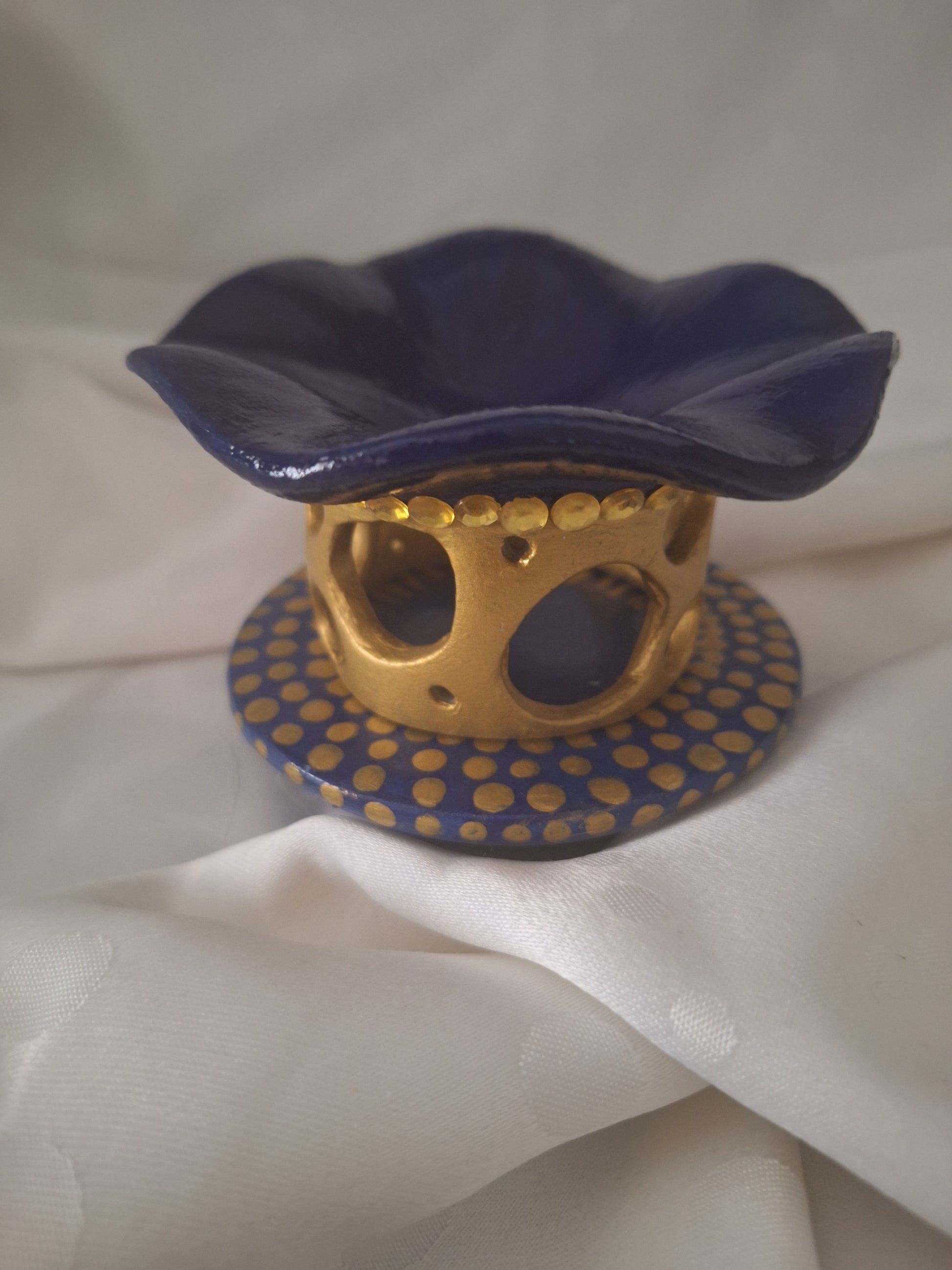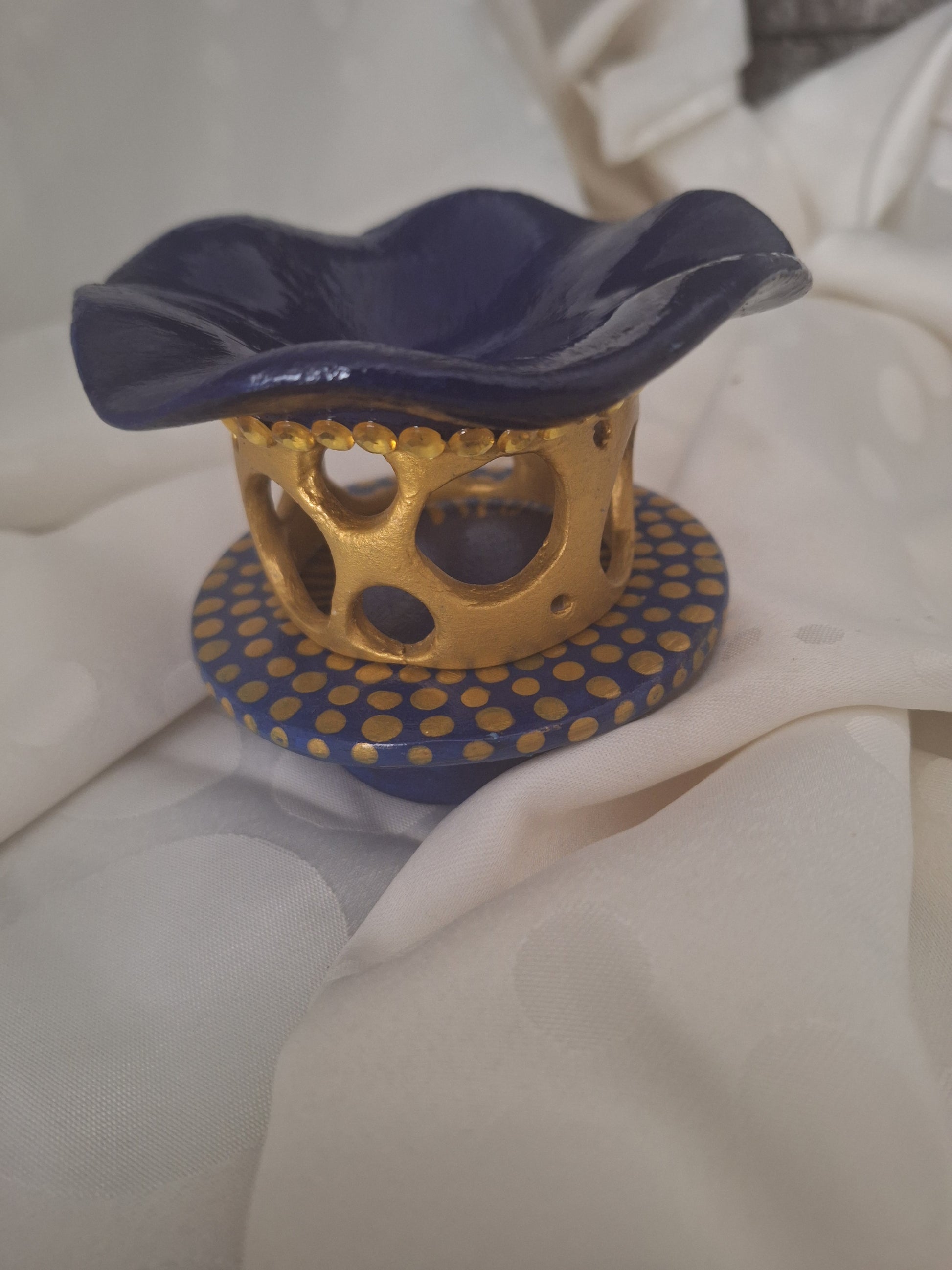 En son centre, un cœur doré ajouré de multiples ouvertures laisse l’air circuler librement, permettant aux effluves parfumés de se diffuser harmonieusement. Le contraste entre la chaleur du doré et la fraîcheur du bleu marin crée un équilibre visuel captivant.
