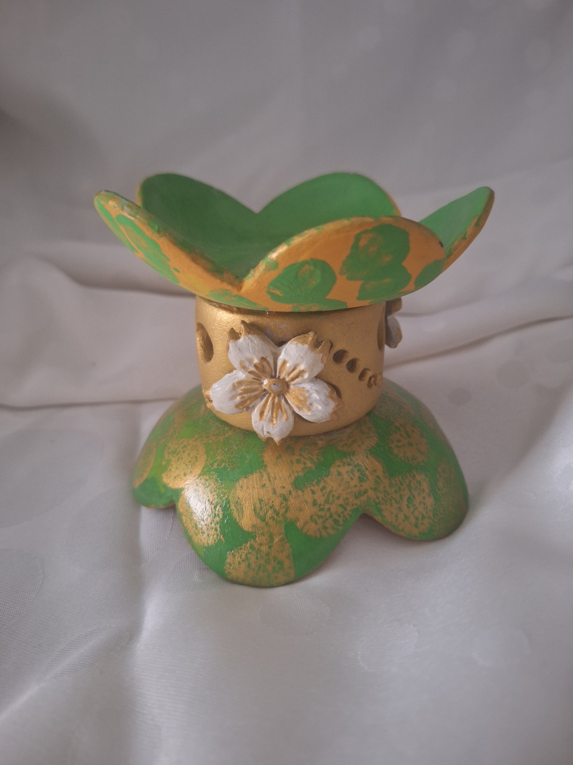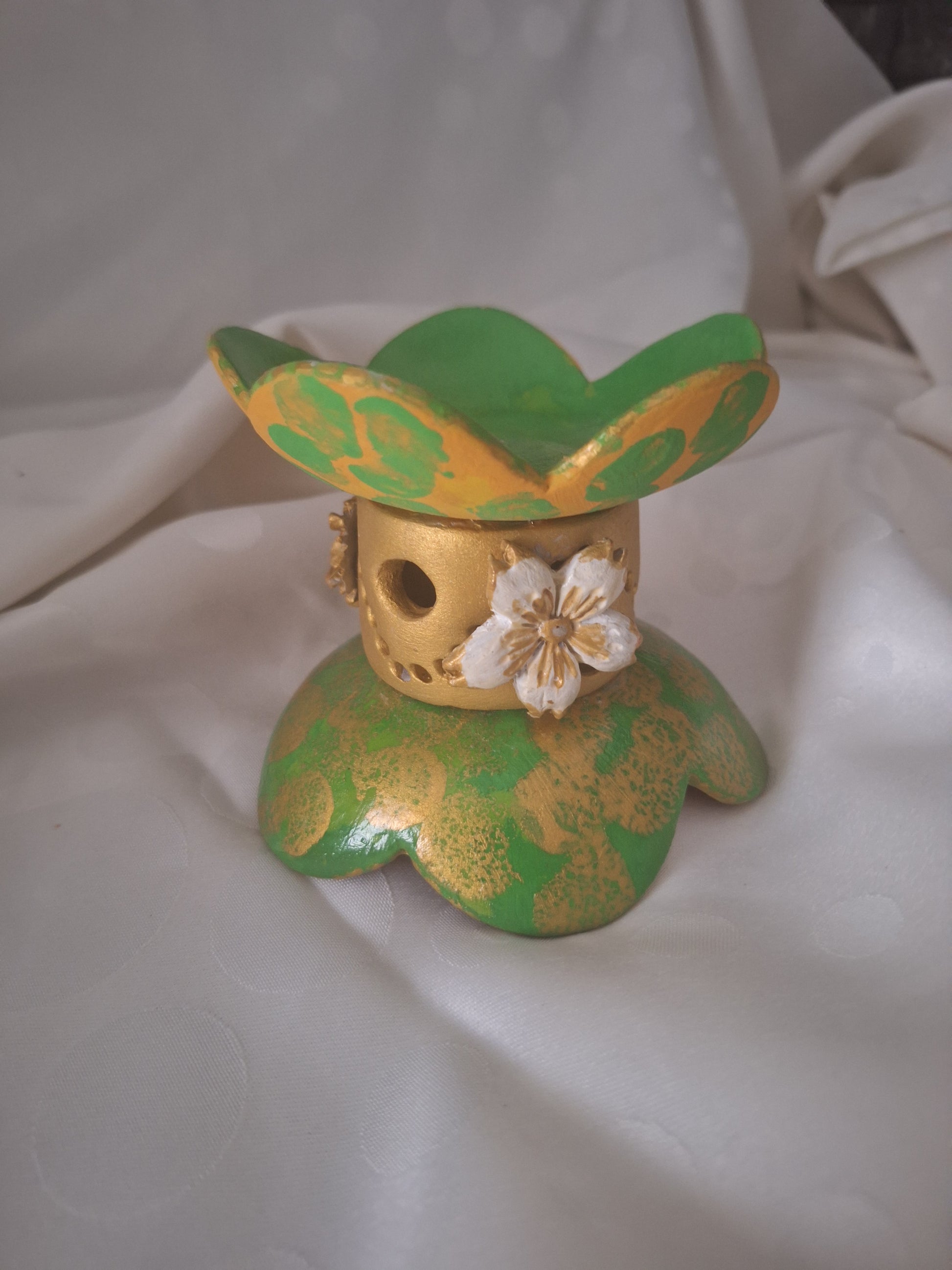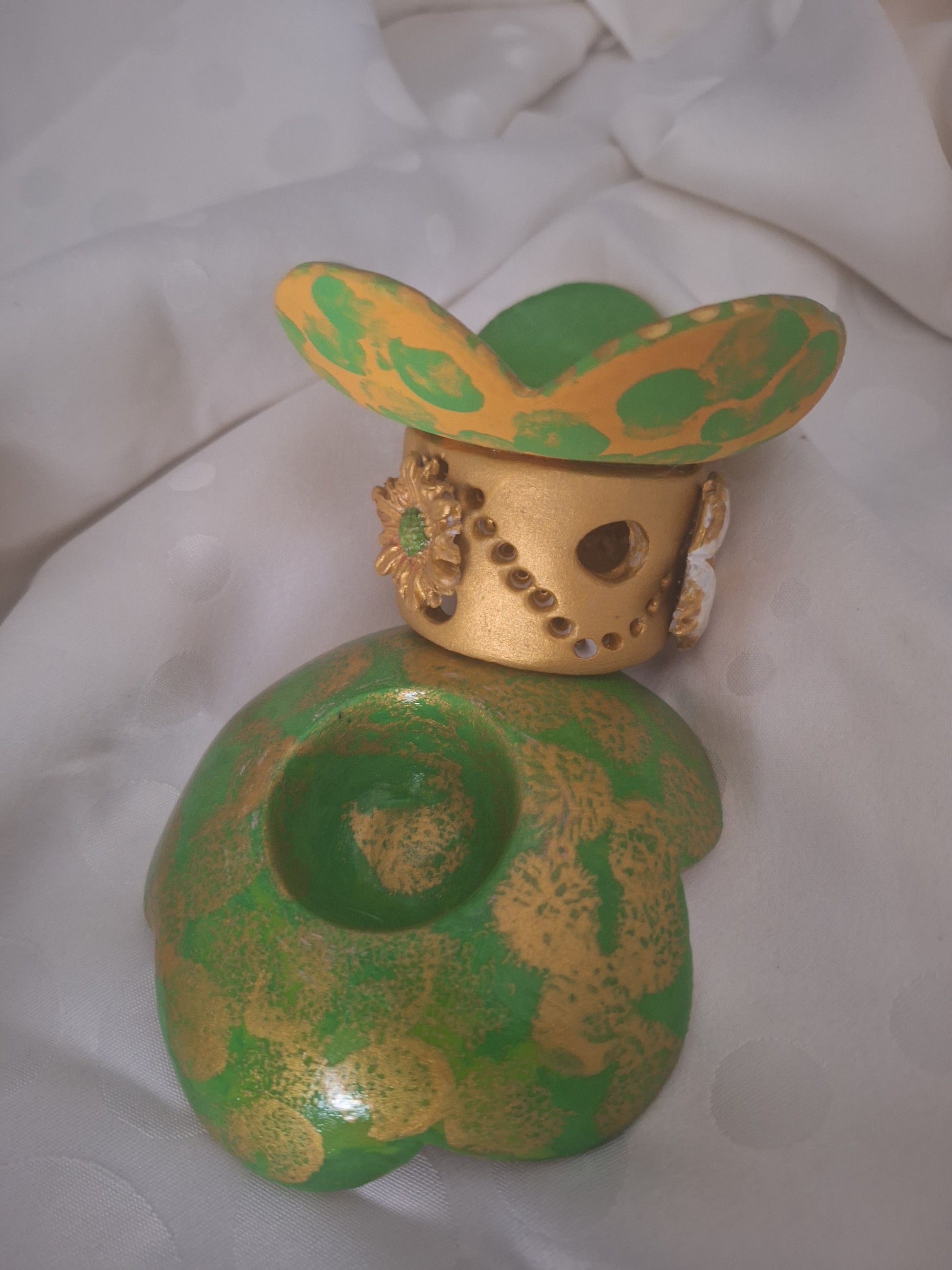 L’alliance du vert végétal et du doré lumineux crée un équilibre subtil entre nature et sophistication, évoquant la sérénité d’un jardin ensoleillé. Ce brûleur ne se contente pas d’être fonctionnel : il devient un objet décoratif à part entière, une invitation à la détente et à la contemplation.
