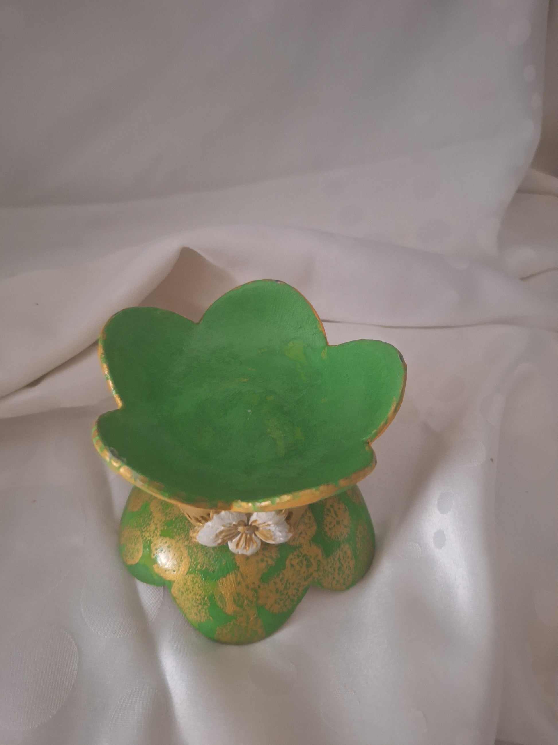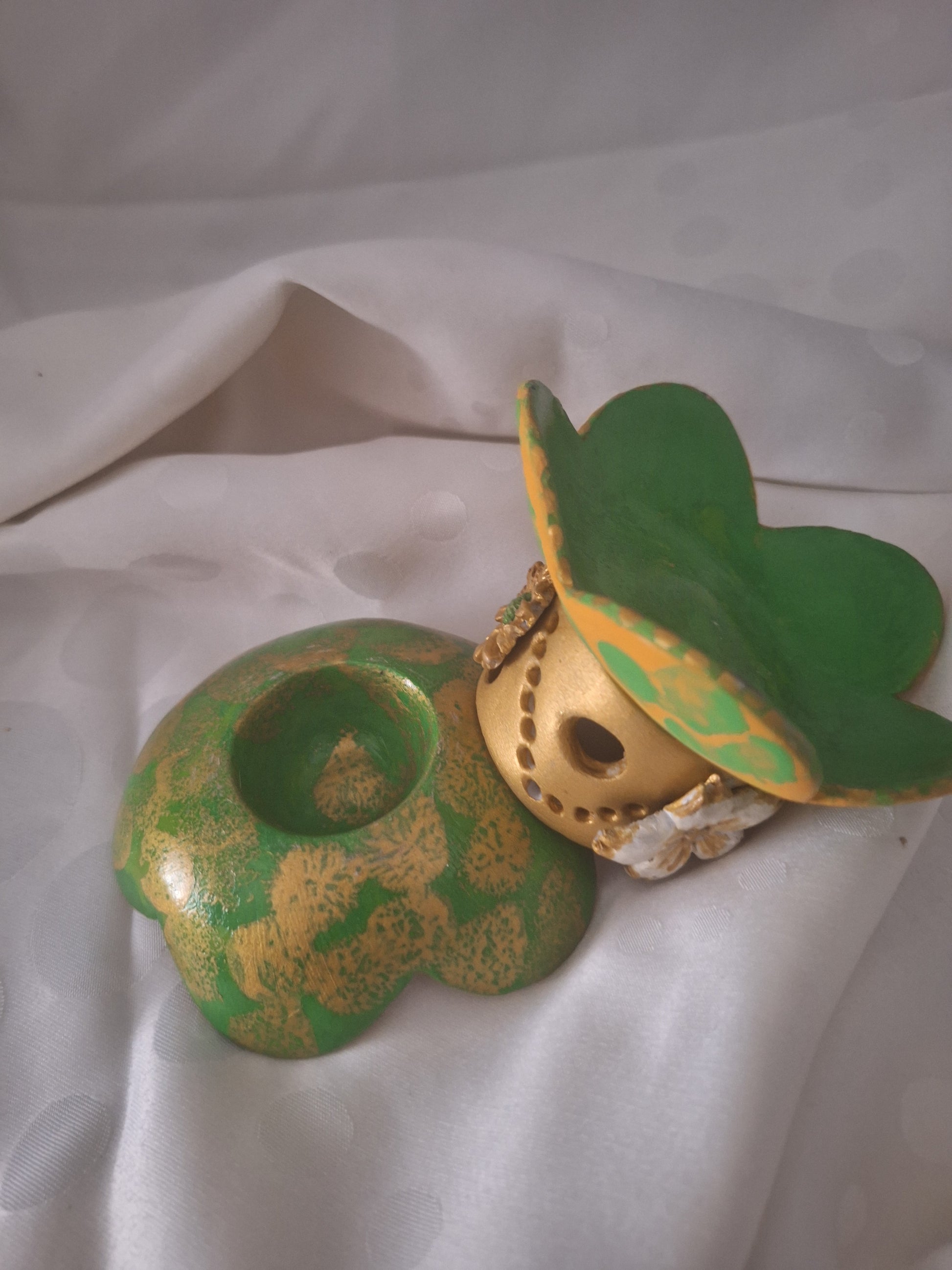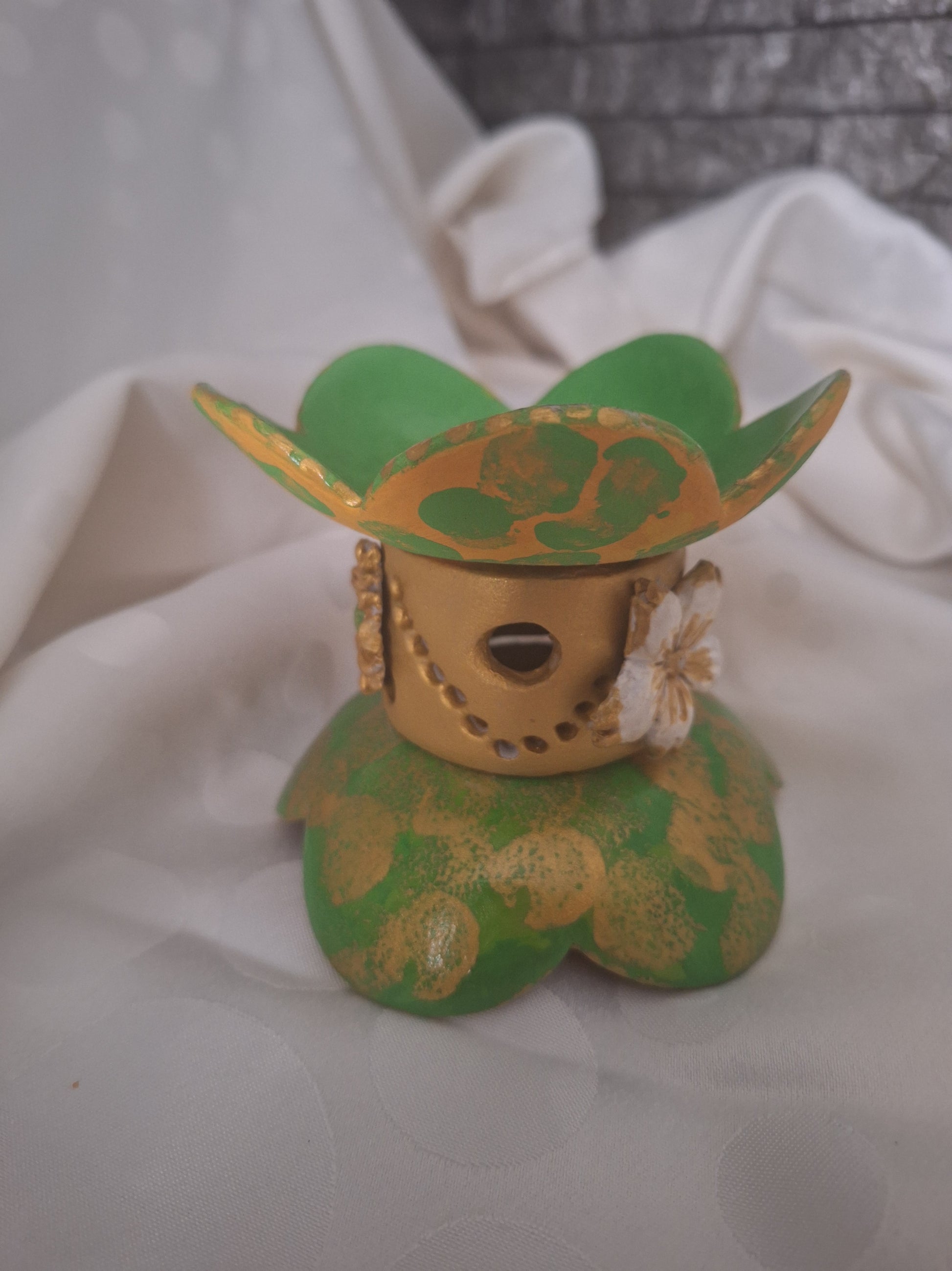 L’alliance du vert végétal et du doré lumineux crée un équilibre subtil entre nature et sophistication, évoquant la sérénité d’un jardin ensoleillé. Ce brûleur ne se contente pas d’être fonctionnel : il devient un objet décoratif à part entière, une invitation à la détente et à la contemplation.