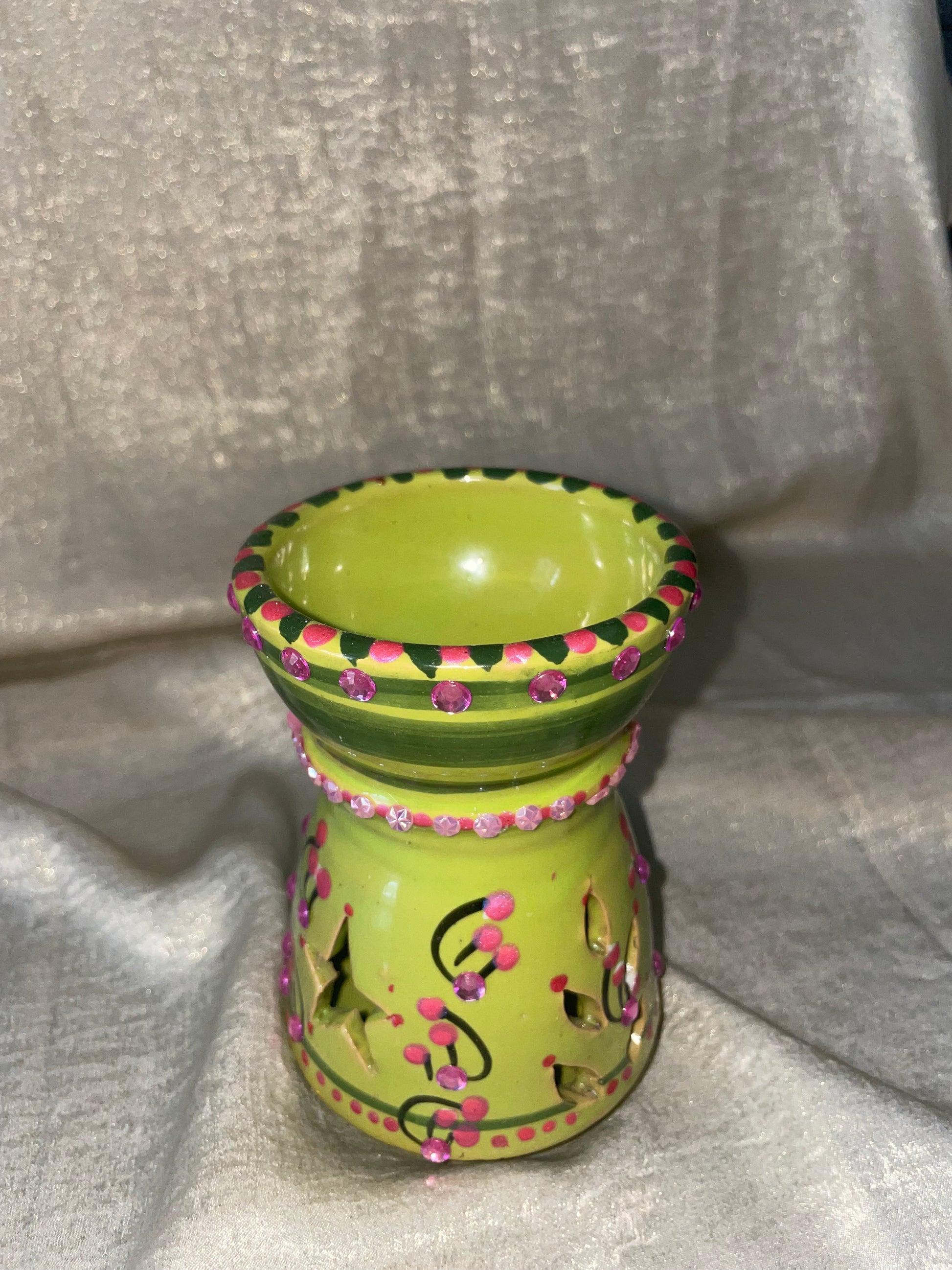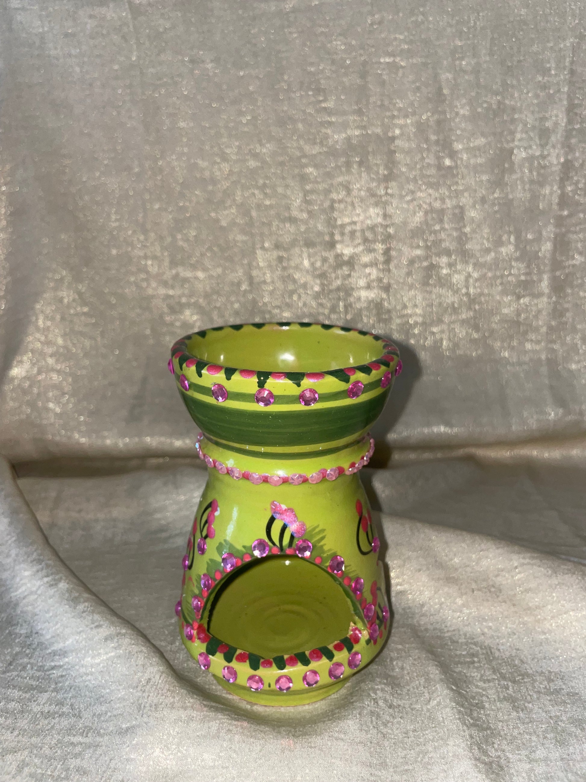 Ce brûleur en céramique, d'un élégant vert profond, séduit par son charme oriental raffiné. Sa silhouette harmonieuse évoque les lignes traditionnelles des objets decoratifs d'Orient, tout en restant sobre et disinguée. La surface brillante met en valeur de délicats ornements de strass, qui apportent une touche lumineuse et précieuse à l'ensemble. Pensé autant comme accessoire fonctionnel, il diffuse subtilement les senteurs tout en embellissent l'espace de ses reflets chauds et scintillants.
