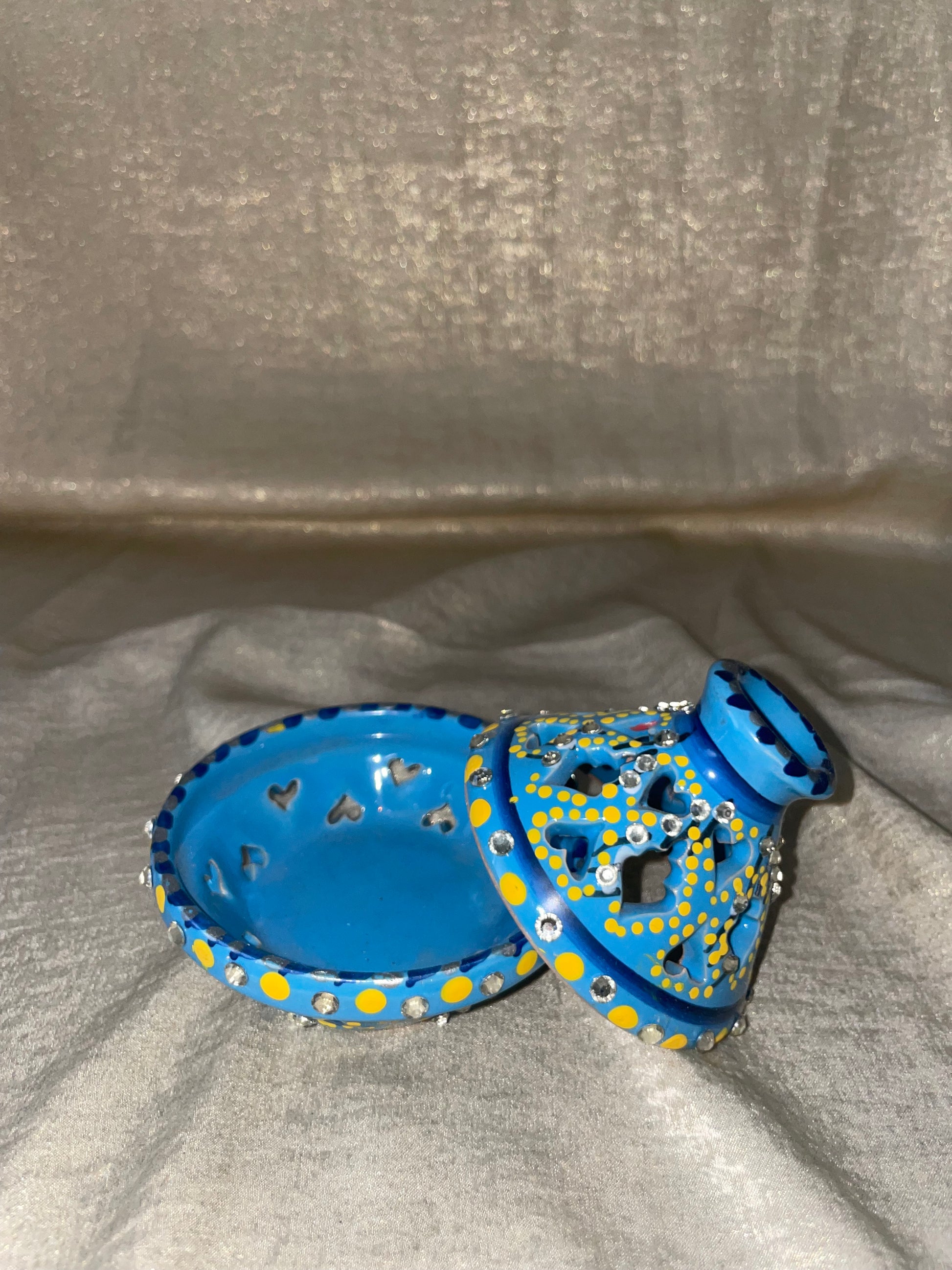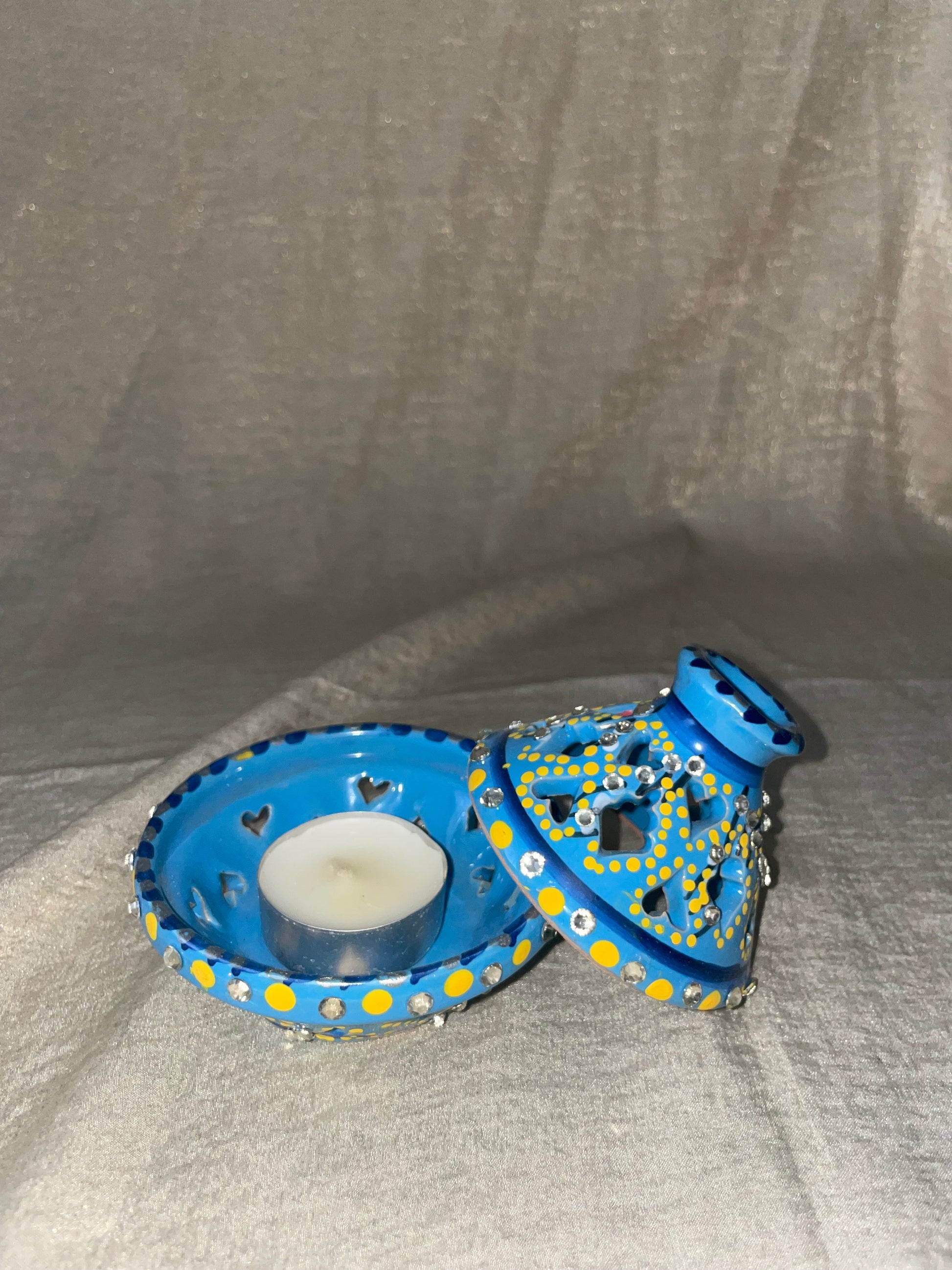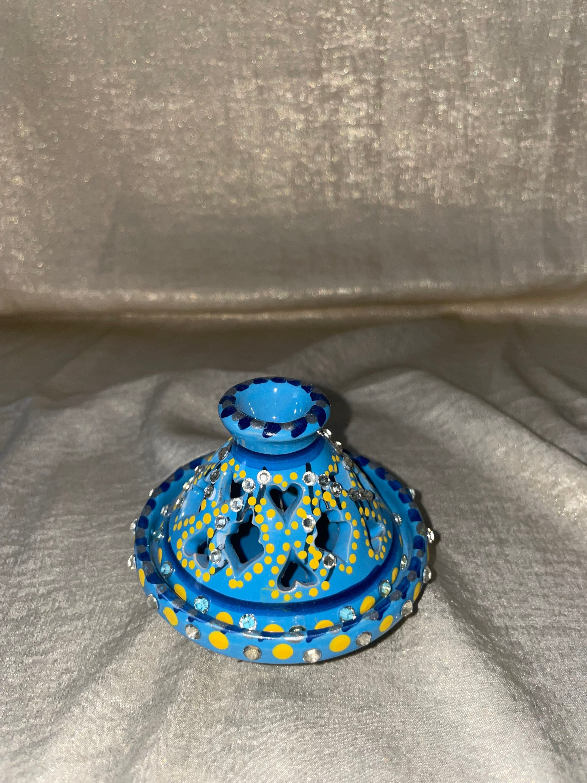 Apportez une touche d'élégance et de chaleur à votre intérieur avec ce magnifique photophore en céramique. Inspiré du style oriental, il séduit par sa couleur bleue ciel et ses détails raffinés. Son décor est délicatement orné de petits strass scintillants, qui reflètent la lumière et créent une ambiance douce et envoûtante dès qu'une Bougie est allumée.