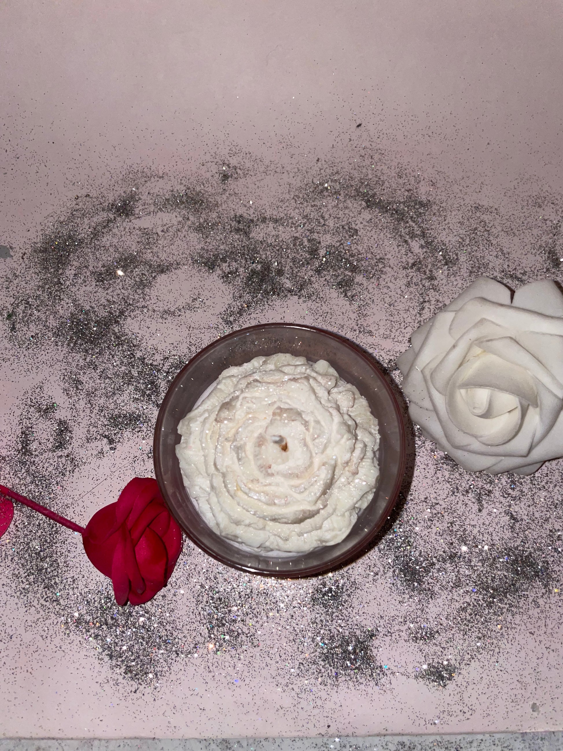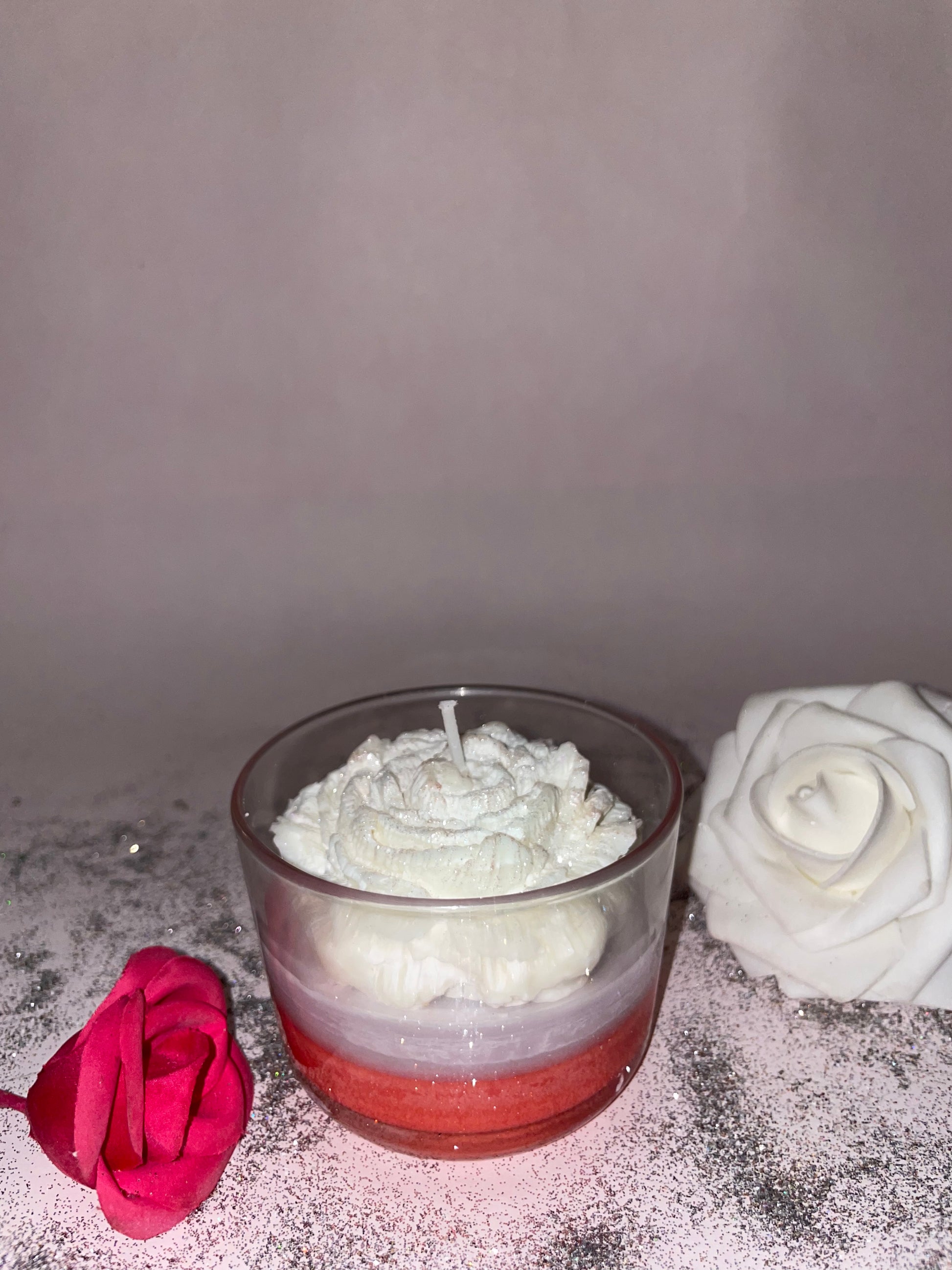 Découvrez cette bougie majestueuse, une composition raffinée et pleine de contraste. Au sommet, une rose blanche éclatante, habillée de paillettes scintillantes, capte la lumière et sublime l’ensemble. Son parfum délicat de linge propre évoque la pureté et la douceur d’un tissu fraîchement lavé.
